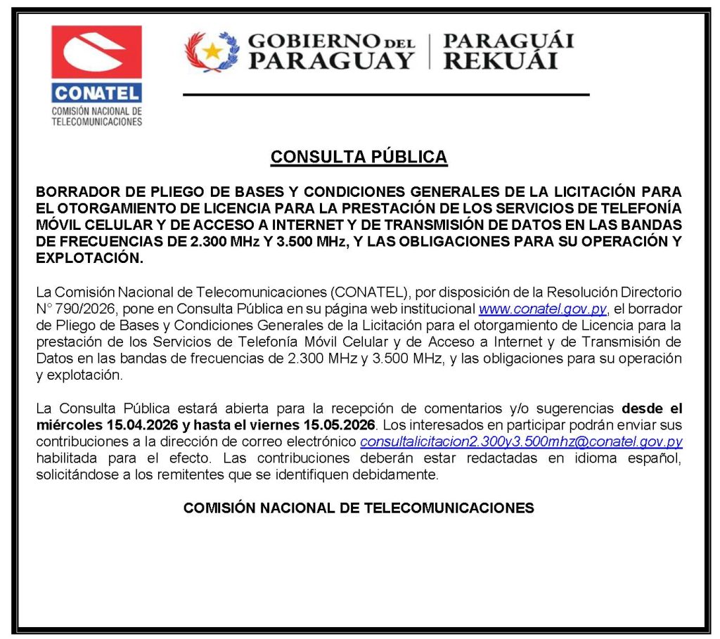 «CONSULTA PÚBLICA: BORRADOR DE PLIEGO DE BASES Y CONDICIONES GENERALES DE LA LICITACIÓN PARA EL OTORGAMIENTO DE LICENCIA PARA LA PRESTACIÓN DE LOS SERVICIOS DE TELEFONÍA MÓVIL CELULAR Y DE ACCESO A INTERNET Y DE TRANSMISIÓN DE DATOS EN LAS BANDAS DE FRECUENCIAS DE 2.300 MHz Y 3.500 MHz, Y LAS OBLIGACIONES PARA SU OPERACIÓN Y EXPLOTACIÓN«