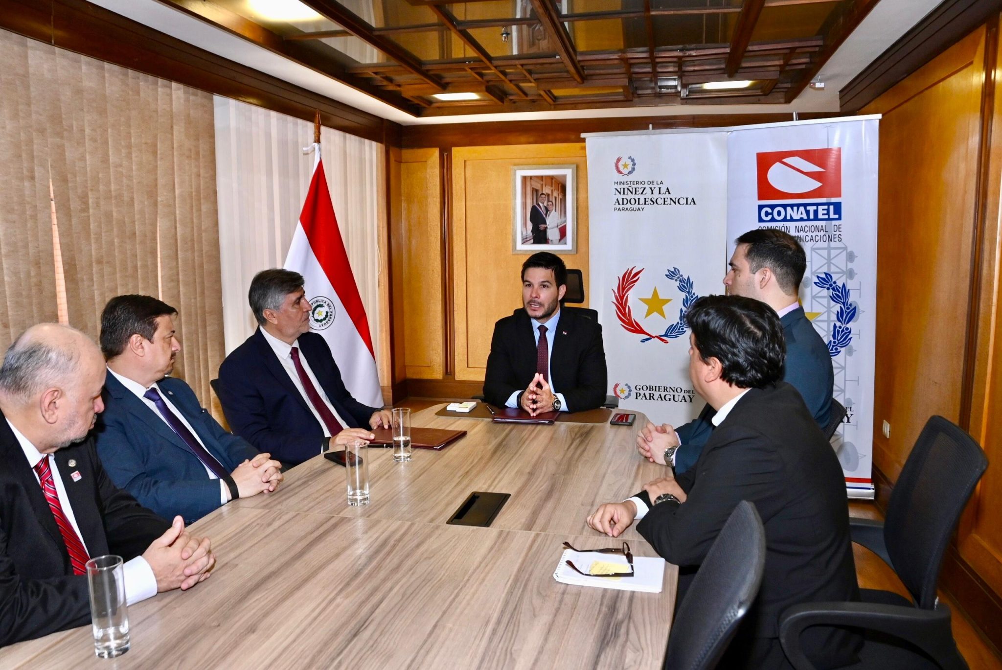 En la fecha, el ministro de la Niñez y la Adolescencia, Walter Gutiérrez, y el presidente de la CONATEL, Ing. Juan Carlos Duarte Duré, llevaron a cabo la firma de un convenio marco que establece condiciones de cooperación interinstitucional entre la Comisión Nacional de Telecomunicaciones y el Ministerio de la Niñez y la Adolescencia. Acompañaron este significativo acto los señores miembros del Directorio de la CONATEL, Abg. Ever Esquível y el Ing. Andrés Arrúa; Así también, del Ministerio la Niñez y la Adolescencia el Director General de Gabinete, Mtr. Rodrigo Segovia y el Director General de Asesoría Jurídica, Abg. Ernesto Benítez.
